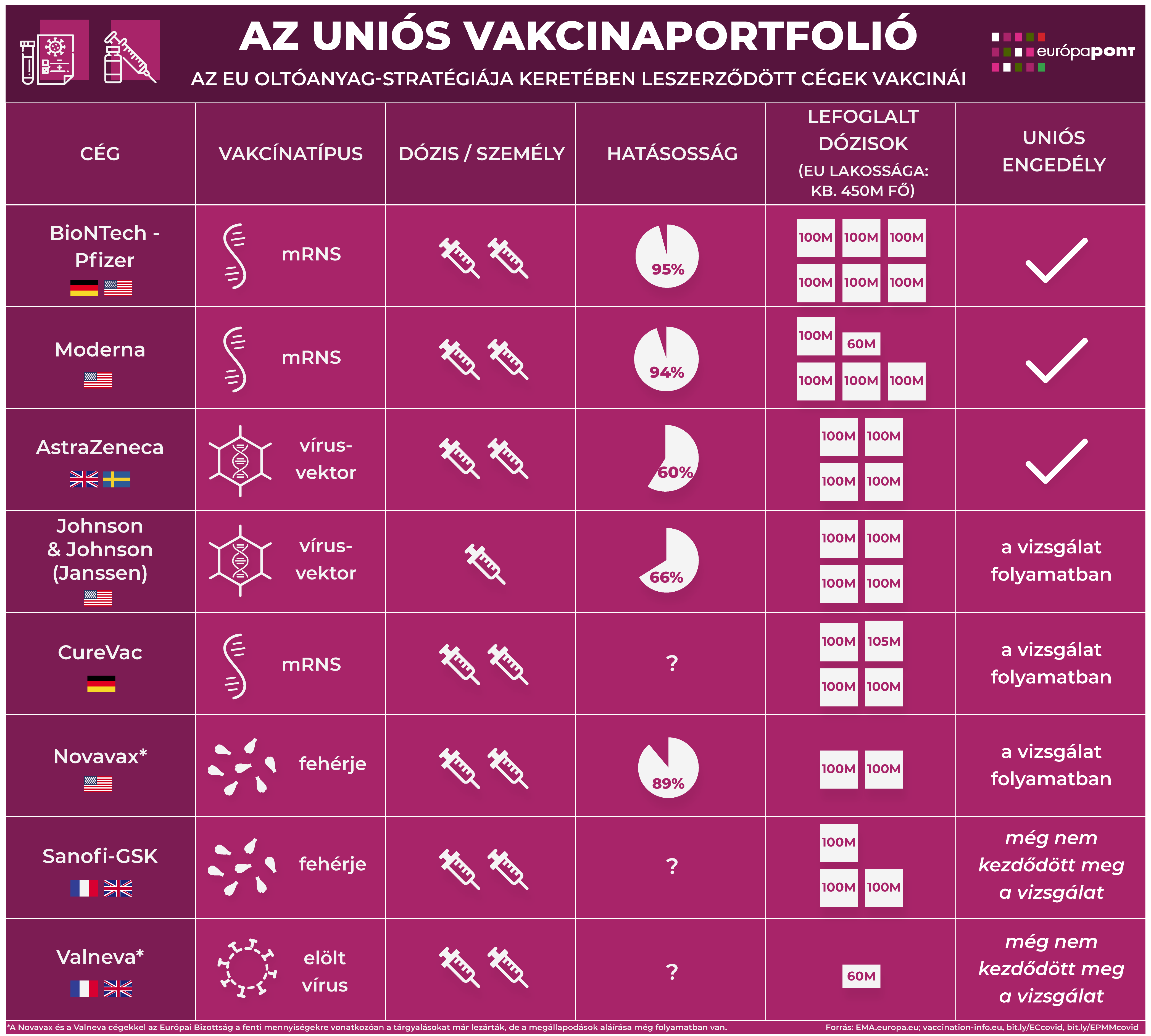 Az Európai Bizottság – az Európai Gyógyszerügynökség (EMA) kedvező tudományos szakvéleménye alapján – eddig a BioNTech-Pfizer, a Moderna és az AstraZeneca COVID19-vakcináira adott forgalombahozatali engedélyt. A Johnson & Johnson (Janssen), a CureVac és a Novavax cégek oltóanyagait jelenleg vizsgálja az EMA, a Johnson & Johnson oltóanyaga várhatóan nagyon rövid időn belül megkaphatja az engedélyt.