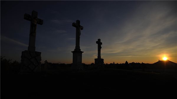 Feszületek a kálváriadombon naplementekor az egyeki lezárt kálváriatemetőben a közelgő mindenszentek ünnepe és halottak napja előtt (felső kép).frtzzEgy sírhely az egyeki lezárt kálváriatemetőben a közelgő mindenszentek ünnepe és halottak napja előtt (alsó kép).