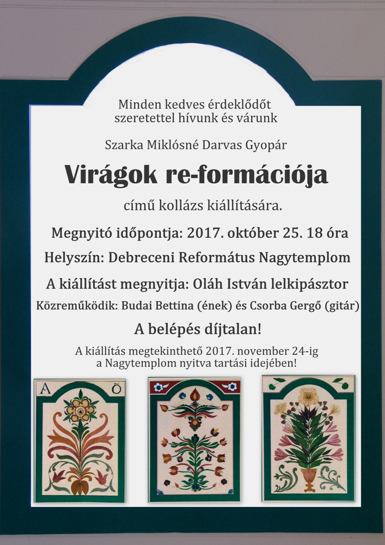 A Virágok re-formációja című kiállítást először láthatja a debreceni közönség. A kiállítás megnyitójára október 25-én (szerdán) 18 órától kerül sor a Nagytemplom Kálvin János Galériáján. A kiállítást megnyitja Oláh István lelkipásztor, bemutatót tart az alkotó, valamint közreműködik Budai Bettina (ének) és Csorba Gergő gitárművész. A megnyitóra a belépés díjtalan!