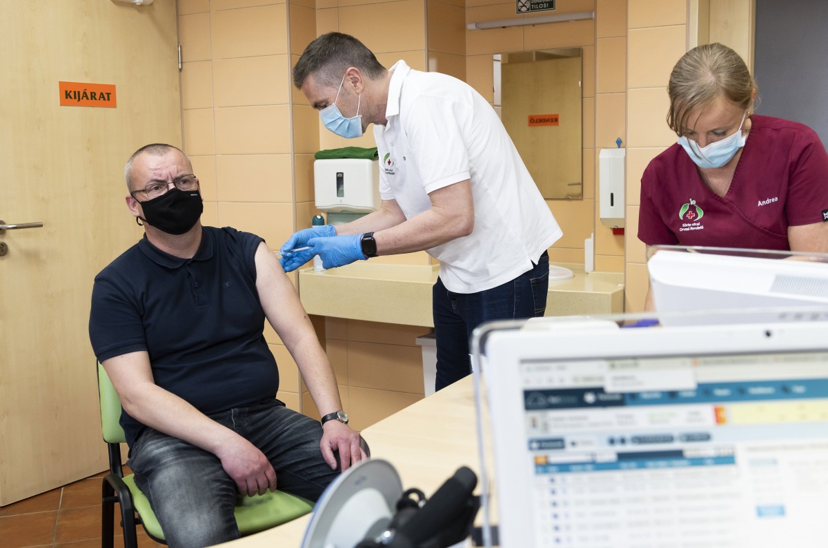 Gulyás Gábor háziorvos egy férfit beolt a német-amerikai fejlesztésű Pfizer-BioNTech koronavírus elleni oltóanyag, a Comirnaty-vakcina első adagjával nyíregyházi rendelőjében 2021. április 21-én.