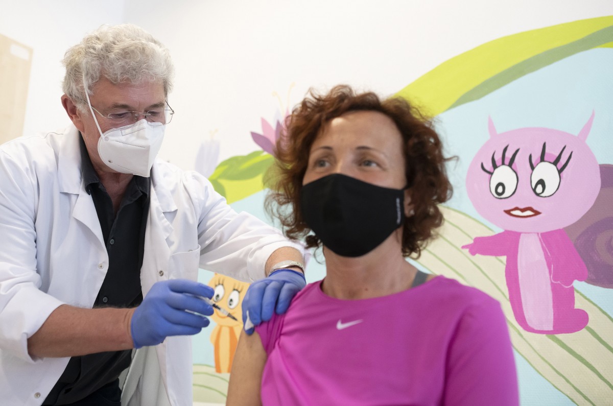 A fotón látható, ahogy Czeglédi Miklós szemész főorvos beolt egy nőt a német-amerikai fejlesztésű Pfizer-BioNTech koronavírus elleni oltóanyag, a Comirnaty-vakcina második adagjával a Jósa András Oktatókórházban kialakított oltóponton 2021. május 2-án.
