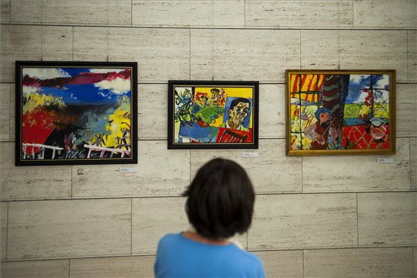 Egy érdeklődő a Fájdalmas örökség – 1956 és Bényi Árpád festőművész emlékezete című kiállítás megnyitóján a debreceni Kölcsey Központban 2016. október 11-én. A november 11-ig látogatható tárlaton az 1956-os elítélt Bényi Árpád ’56 szellemében festett, a debreceni önkormányzatnak adományozott képei mellett az életmű legfontosabb festményeiből, akvarelljeiból és grafikáiból összeállított válogatást mutatnak be. MTI Fotó: Czeglédi Zsolt