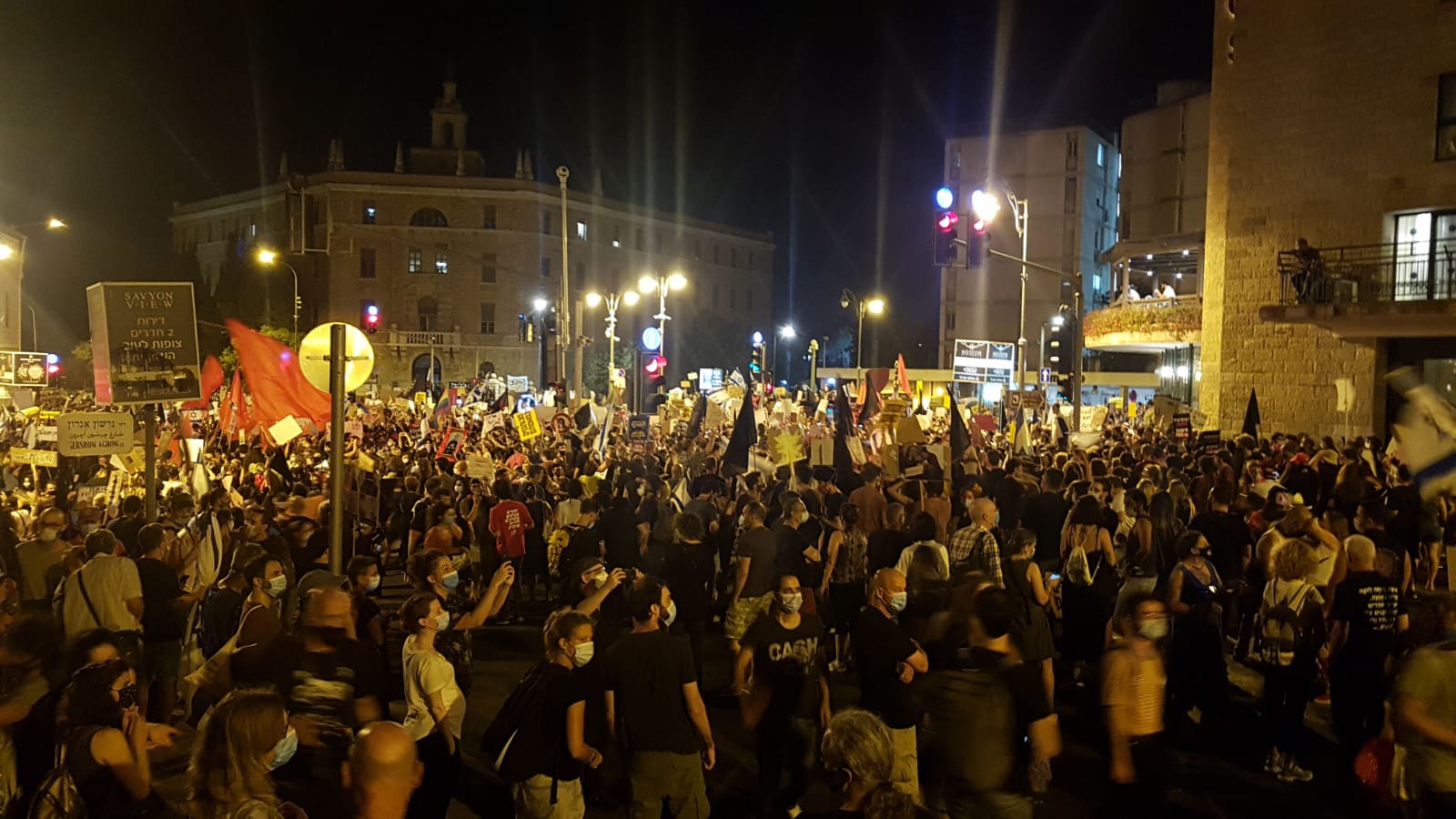 Előzőleg több ezren az izraeli parlamentnél, a kneszetnél gyülekeztek, onnan vonultak át a forgalom elől elzárt utcákon trombitálva, dudálva, dobolva, szlogeneket kiabálva és énekelve a Balfour utcához, a tiltakozások szokásos helyszínéhez.