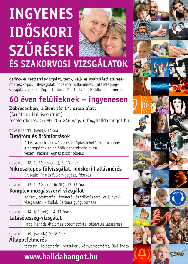 Tovább folytatják a szeptemberben megkezdett ingyenes szűrőprogramjainkat, ezúttal a 60 éven felüliek részére szerveznek különböző szűréseket és vizsgálatokat. November 10-től 21-ig többek között gerinc- és testtartásvizsgálatra, térd-, váll- és nyakízületi szűrésre, mikroszkópos fülvizsgálatra, időskori hallásmérésre, testzsír- és állapotfelmérésre várják az érdeklődőket Debrecenben a Bem tér 14. szám alatt. Valamennyi program ingyenes, azokra bejelentkezni a 06-80-205-246-os számon vagy az info@halldahangot.hu címen lehet.