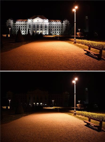 A Debreceni Egyetem főépülete a Föld órája elnevezésű akció előtt, kivilágítva (felül), és az akció idején, kivilágítatlanul 2017. március 25-én este. A Természetvédelmi Világalap (WWF) nemzetközi energiatakarékossági akciójának célja, hogy felhívja a figyelmet a klímaváltozás hatásaira, a globális felmelegedés elleni összefogásra és a Föld védelmére.