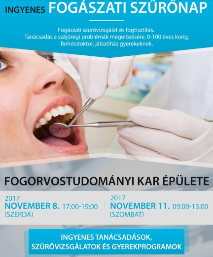 Ingyenes szűrőnap lesz a Fogorvostudományi Karon Egyetem Helyi hírek november 4, 2017Szabolcs SzilágyiSzóljon hozzá a Ingyenes szűrőnap lesz a Fogorvostudományi Karon bejegyzéshez Ingyenes tanácsokkal, szűrővizsgálatokkal, gyerekprogramokkal várják az érdeklődőket. Tetszett? Oszd meg másokkal is!