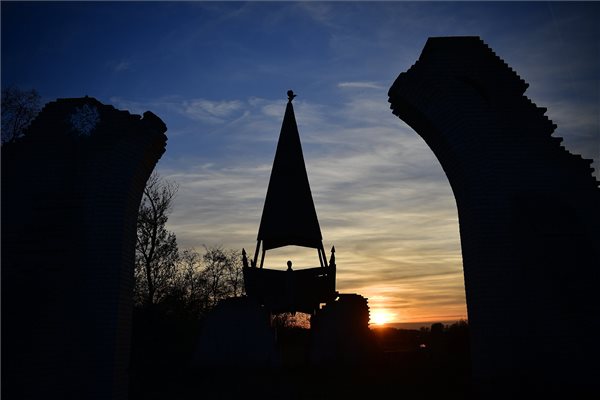 Az egykori település, Parlag a naplementében 2017. november 5-én. Dombostanya vasúti megállójától nyugatra fekszik az Árpád-kori, mára elnéptelenedett Parlag falu, ahol az egykori templom romjára emlékmű épült 1993-ban Rácz Zoltán tervei alapján. MTI Fotó: Czeglédi Zsolt