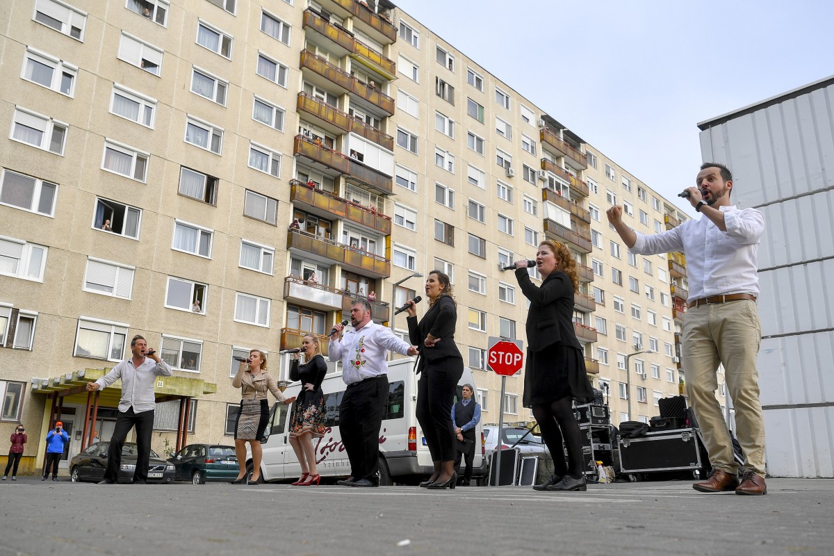Felső kép: Udvarhelyi Péter, Törő Ildikó, Donkó Annamária, Donkó Imre, Kuczmog Klaudia, Pálné Simon Erika és Antóni Norbert a Csokonai Nemzeti Színház énekkarának tagjai énekelnek a Vénkerti-lakótelepen Debrecenben 2020. április 13-án. A koronavírus-járvány miatt a színház tagjai Csokonai-szerenádok néven a város lakótelepeit járva rövid szórakoztató műsort adnak a lakóknak. MTI/Czeglédi Zsolt