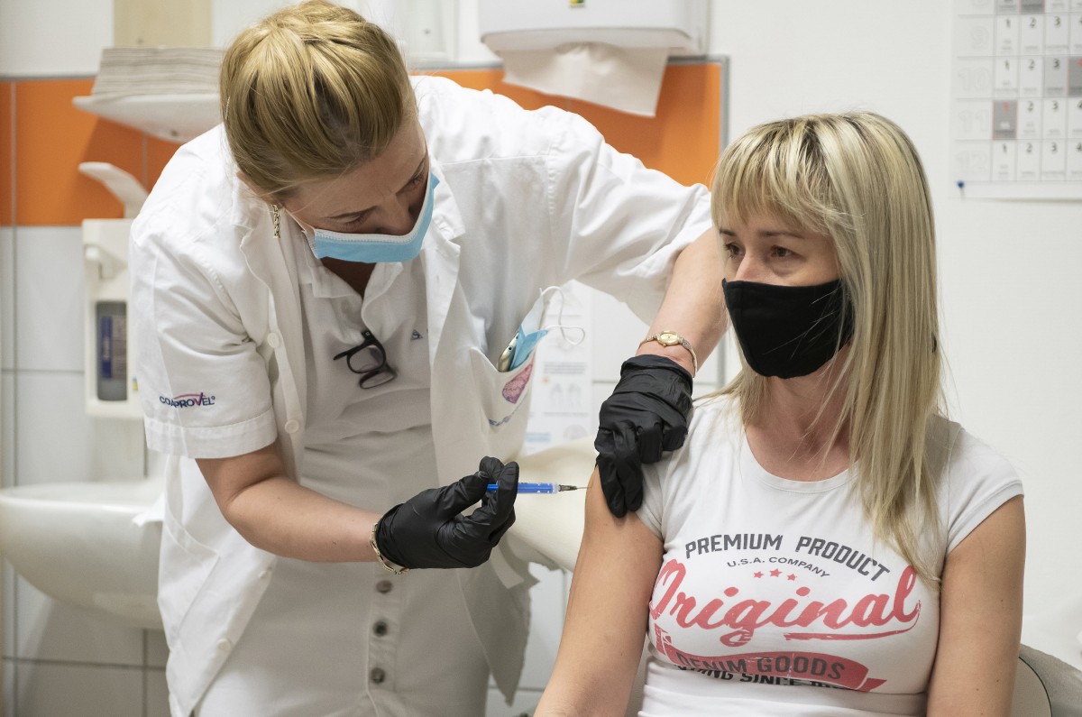 Április 10-én szombaton Szputnyik vakcinával oltottak Nyíregyházán. Az MTI fotóján látható, ahogy Mezei Klára onkológus főorvos beolt egy nőt a Szputnyik V koronavírus elleni vakcina első adagjával a Jósa András Oktatókórházban kialakított oltóponton.