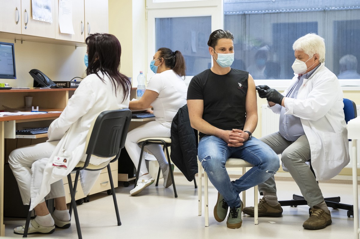 Orosz László szülész-nőgyógyász főorvos beolt egy férfit a Pfizer-BioNTech koronavírus elleni Comirnaty-vakcina második adagjával a Jósa András Oktatókórházban kialakított oltóponton 2021. április 19-én.