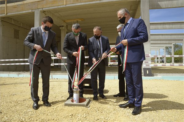 Kép: Kocsis Róbert, a Magyar Tejgazdasági Kísérleti Intézet Kft. ügyvezetője, Gyuricza Csaba, a Magyar Agrár- és Élettudományi Egyetem rektora, Nagy István agrárminiszter, Unger András, az intézet korábbi ügyvezetője és Árvay István polgármester (b-j) a Magyar Tejgazdasági Kísérleti Intézet Kft. több mint hárommilliárd forintból épülő kutatás-fejlesztési és innovációs központjának alapkőletételén Mosonmagyaróváron 2021. április 30-án. MTI/Krizsán Csaba