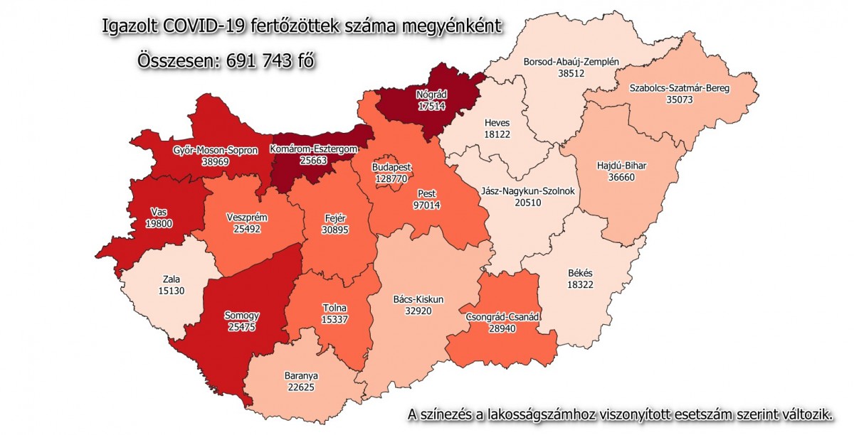 A kormányzati portálon azt írták: 691 743-ra nőtt a Magyarországon azonosított fertőzöttek száma. Az elhunytaké 22 098-ra, a gyógyultaké 418 568-ra emelkedett.